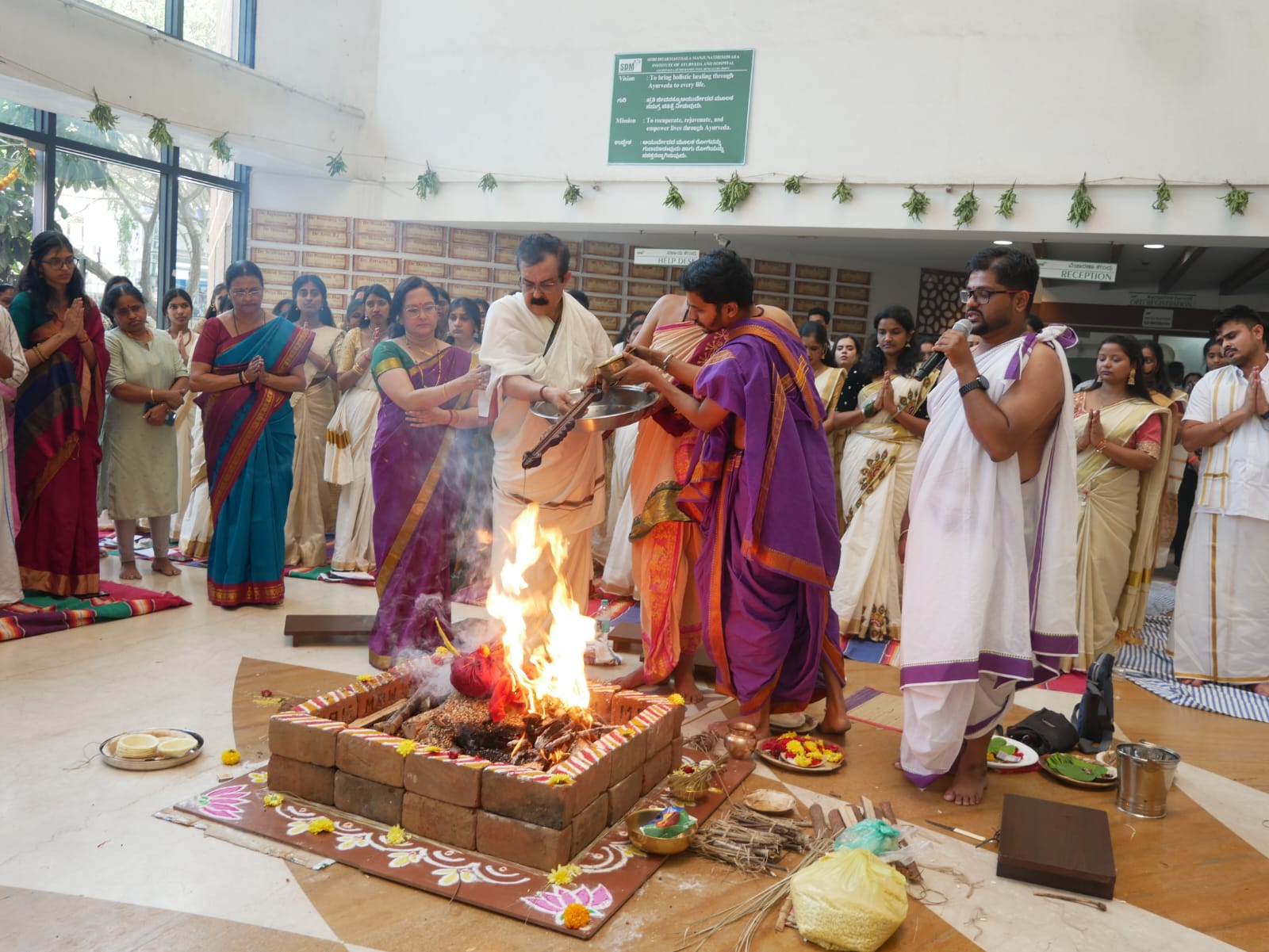 The ceremony commenced at 9:30 a.m. with the sacred Dhanwantari Homa, invoking the blessings of Lord Dhanwantari, the divine physician. The ritual created a spiritually uplifting atmosphere, symbolizing purification, knowledge, and commitment to the healing profession. Faculty members, students, and invitees participated with devotion and reverence.